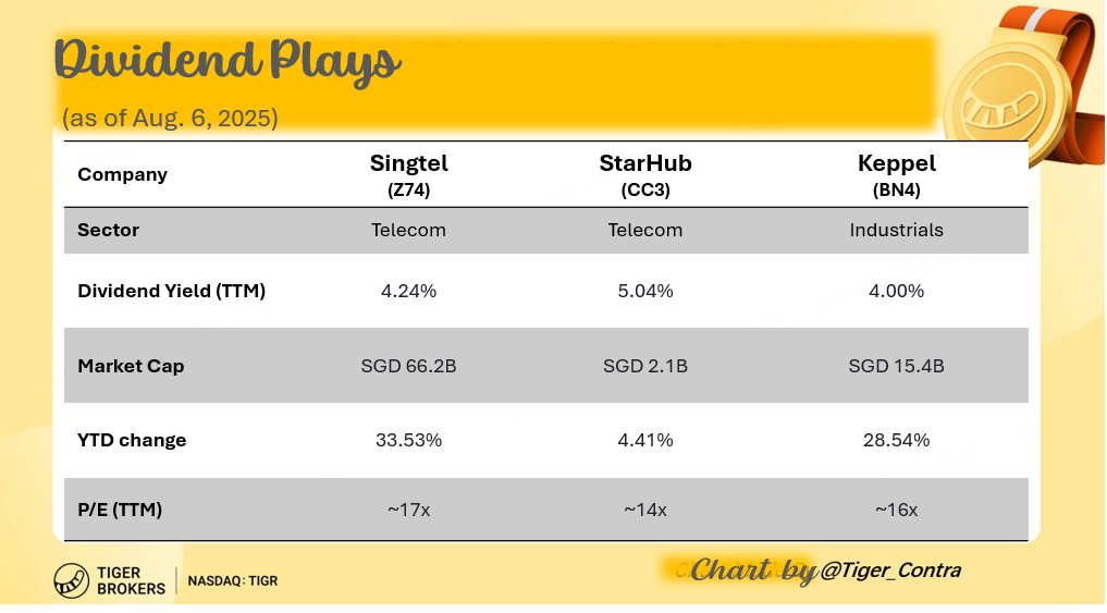 Income investors may find attractive opportunities in these high-yield telecom stocks. Local telecom giants remain favored for their stability and strong dividends, with impressive year-to-date performance: $Singtel(Z74.SI)$/$StarHub(CC3.SI)$/$Keppel(BN4.SI)$.