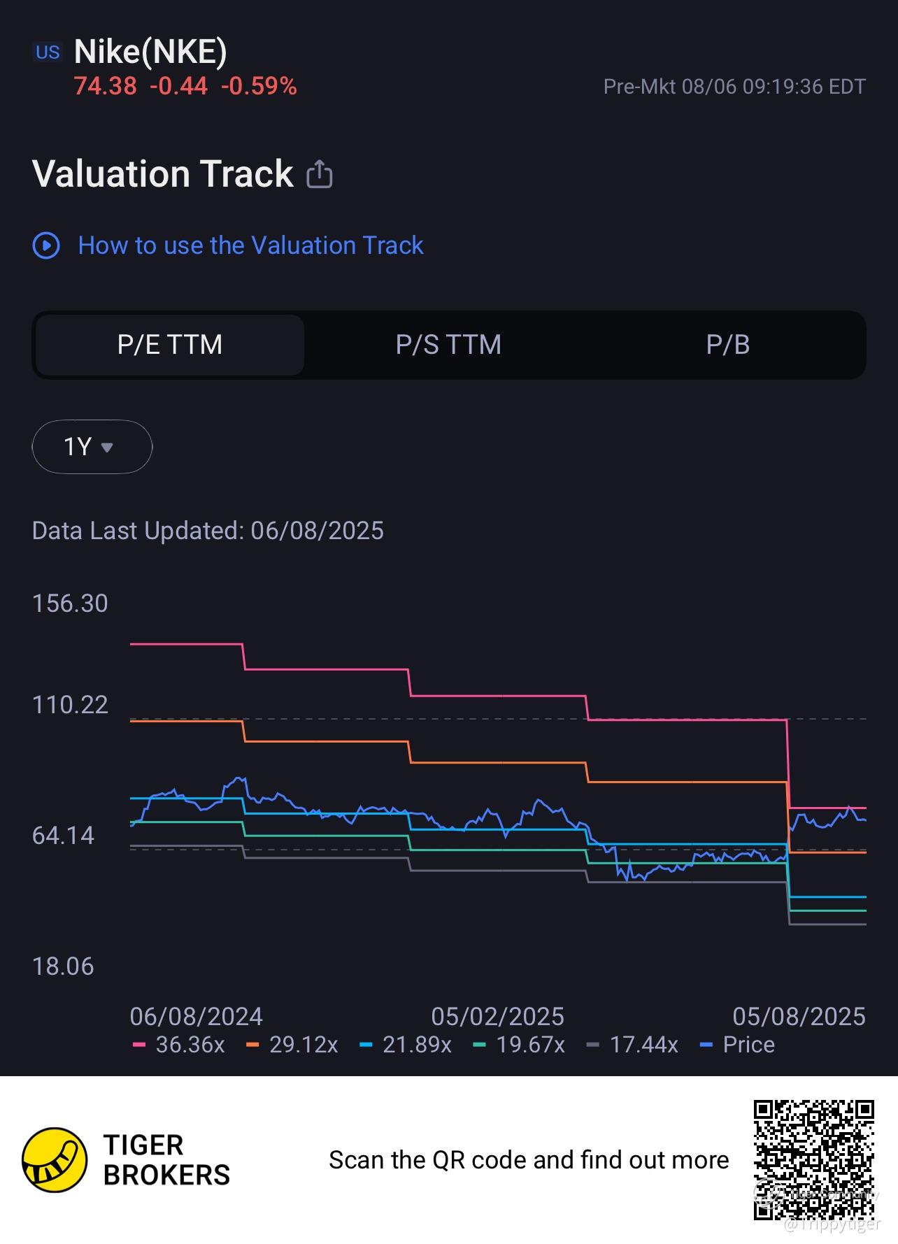 Valuation, though, is where the plot thickens. Nike’s P/E multiples have steadily compressed over the past year — the top end of the band collapsing from the 30s into the high teens. Price, meanwhile, has clawed back from its spring lows, wedged between the mid-range and the next valuation ceiling. Translation: the stock isn’t as frothy as it once was, but it’s not screaming cheap either.