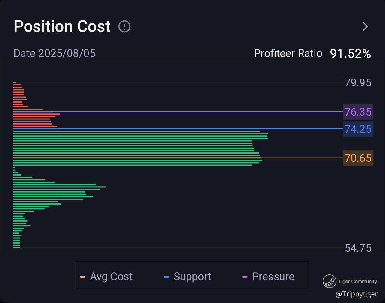 The position cost distribution tells a story of dominance: a staggering 91.52% of holders are in profit, with the average cost sitting comfortably at $70.65 against the current $79 handle. Support is stacked deep at $74.25, giving bulls a sturdy floor. But the purple “pressure” band at $76.35 hints that, while profit-takers haven’t shown their hand yet, the temptation grows with each uptick.