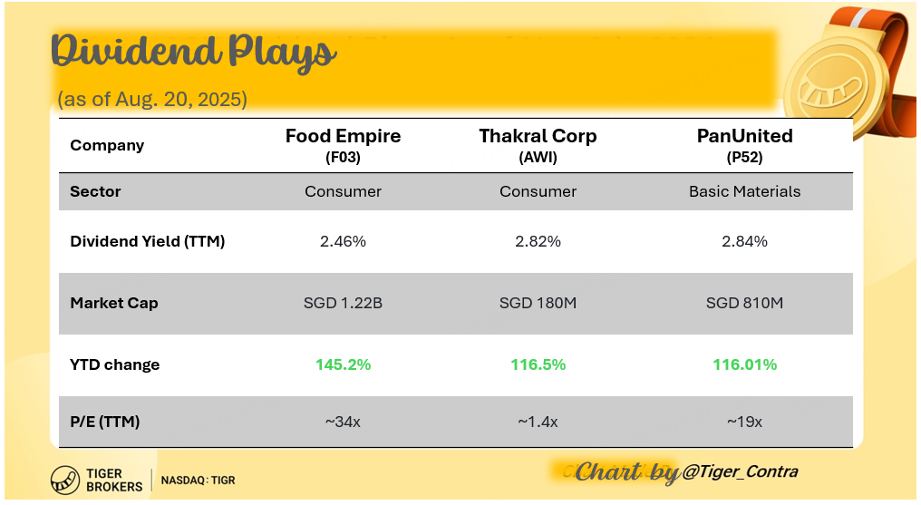 Thanks to strong business performance, numerous Singapore-listed companies have doubled in value and offer attractive dividend payouts. These stocks, with their shareholder-friendly policies, present compelling opportunities before their ex-dividend dates. Among the top dividend plays are 🔍 $Food Empire(F03.SI)$ / $Thakral(AWI.SI)$ / $PanUnited(P52.SI)$.
