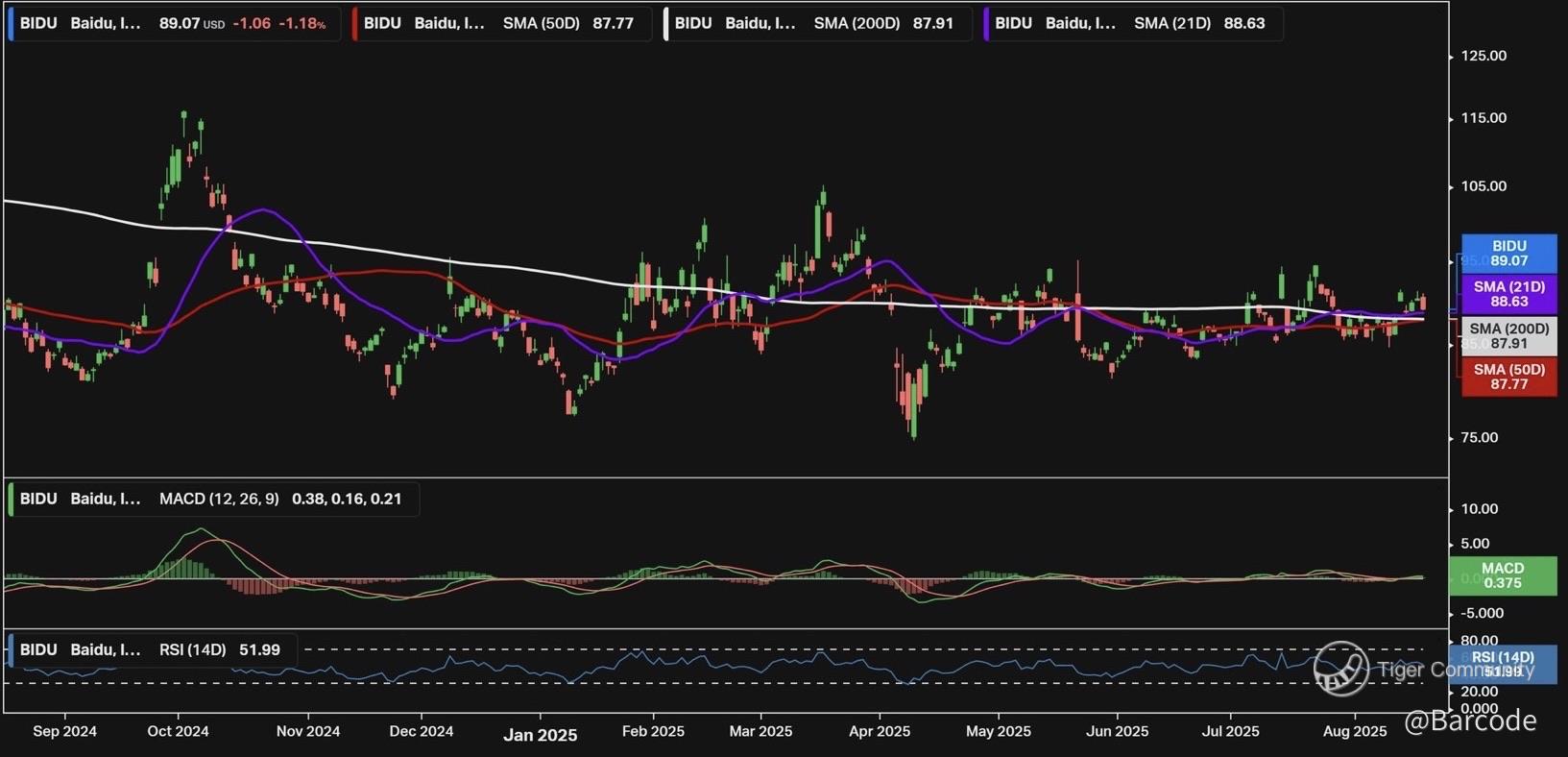 $BIDU has got to be the lowest vol stock I’ve ever seen, trades like a bond. With the 21D, 50D, and 200D all clustering around $88, the technical base looks tight. Price is sitting above every key moving average, which adds conviction that the next leg higher could be sharp.