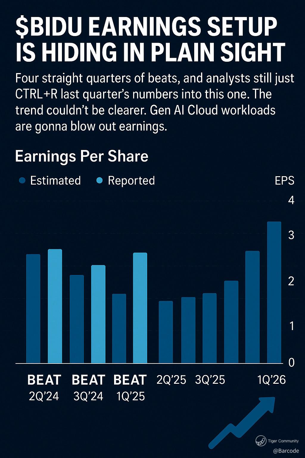 $Baidu(BIDU)$ 🚀📊🔥 $BIDU earnings setup is hiding in plain sight. Four straight quarters of beats, and analysts still just CTRL+R last quarter’s numbers into this one. That’s not analysis, that’s copy-paste. The trend couldn’t be clearer. Gen AI Cloud workloads are the real engine here, and I’m expecting another blowout when the print hits.