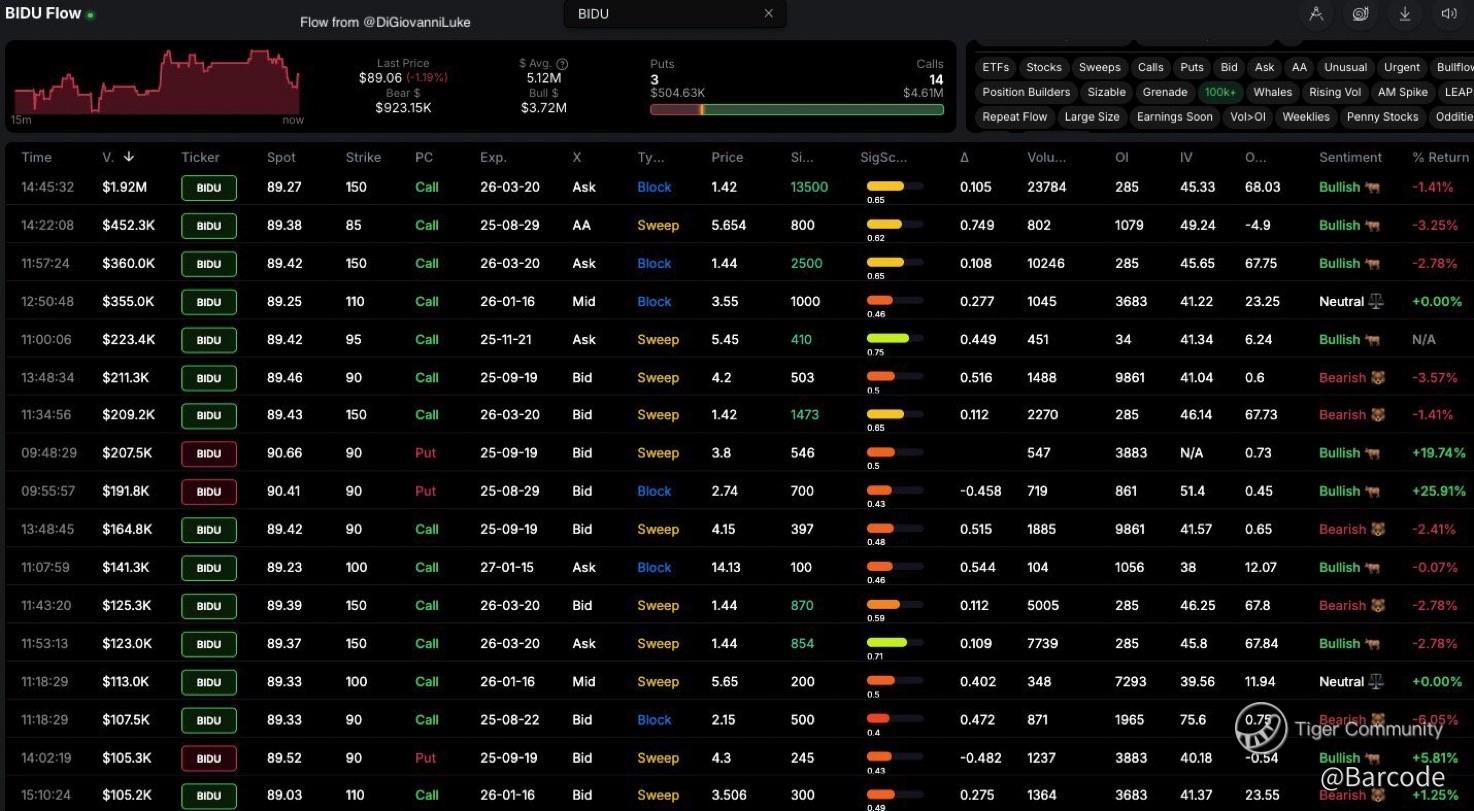 More bullish $BIDU flow hitting today, with $2.5M in premiums laid down. Feels like someone’s positioning ahead of the print. Someone always knows.