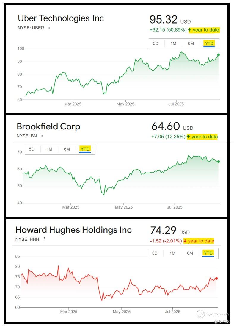 Of the other 3 Ackman stocks, Uber & Brookfield Corp have fared well 8 months into 2025.