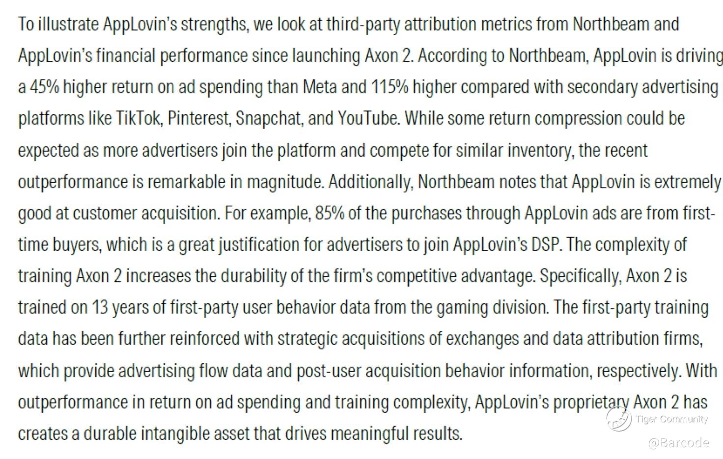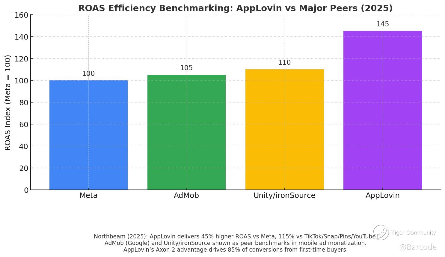 Northbeam’s dataset shows AppLovin delivering 45% higher ROAS than Meta and 115% higher than TikTok, Snapchat, Pinterest, and YouTube. Even more striking: 85% of APP’s conversions are first-time buyers. I’m fully convinced this black-box optimizer, trained on 13 years of first-party data, is a compounding moat. The data clearly visualizes APP at 145 vs Meta’s 100 baseline.