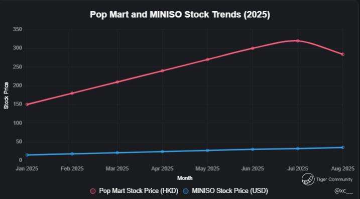 $Pop Mart International Group Limited(POPMF)$ Pop Mart is stirring excitement with Labubu 4.0 set to launch next Thursday, but the buzz is tempered by a sharp drop in secondhand prices for hot Labubu and Crybaby models, now nearing official retail levels on platforms like Taobao. This trend raises questions about fading hype, potentially signaling a stock pullback despite the company’s record H1 2025 revenue of 13.88 billion yuan (up 204%) and profit of 4.709 billion yuan (up 362%). With the S&P 500 at 6,466.58, Bitcoin at $115,000, and oil at $75/barrel amid 30-35% tariffs, the VIX at 14.49 suggests stability, but Pop Mart’s stock at HK$284 (up 270% YTD) faces scrutiny. As Labubu’s revenue share drops to 34.7%, is this a healthy shift or a warning? If Pop Mart feels pricey, consider MINISO, with its IP product growth surging 28.6% internationally and 80% in the U.S., adding 189 stores in Q2. Is it time to cash out or hold for HK$300? This deep dive explores the dynamics, market sentiment, and strategies to navigate the hype.