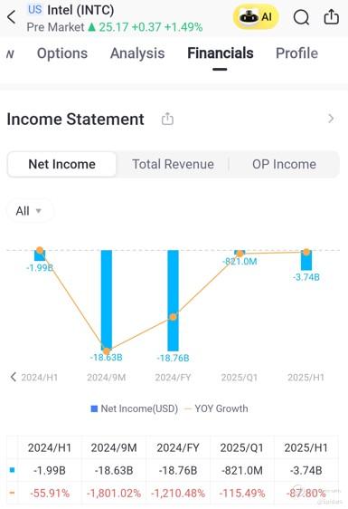 Despite the rally, I am hesitant to jump in at current prices. My primary concern is profitability. Over the past few quarters, Intel’s net income has been relatively weak, which raises questions about its ability to sustain growth, especially in a highly competitive semiconductor market dominated by players like AMD, NVIDIA, and TSMC.
