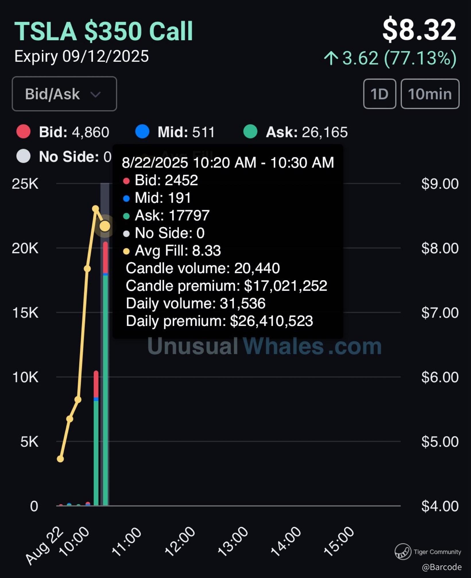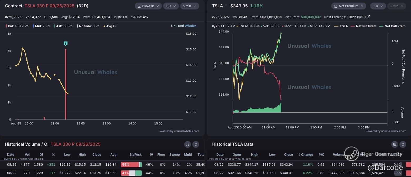 I’m here for the flows, and the conviction is clear. A $26M single-leg purchase of 350C set the tone, part of over $27M in call buying versus $12M in put selling. At the same time, $5.4M was sold-to-open on 330P for September expiry. This activity lifted Tesla more than $7 intraday (+2.1%). When institutions commit nearly $30M to upside in <90DTE, it isn’t speculation; it’s tactical positioning.
