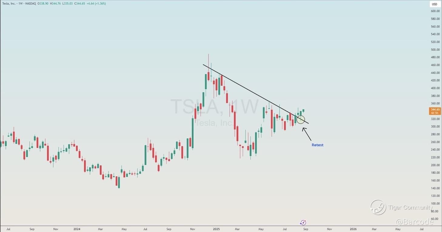 $Tesla Motors(TSLA)$ $Ford(F)$ $NVIDIA(NVDA)$ I’m fully convinced Tesla has reached one of its most consequential turning points of 2025. The weekly breakout retest landed to the penny, and the tape is confirming strength with aggressive call flow and volume expansion. This is not just technical noise; it’s a broader re-rating of Tesla’s role in AI, EVs, and robotics.