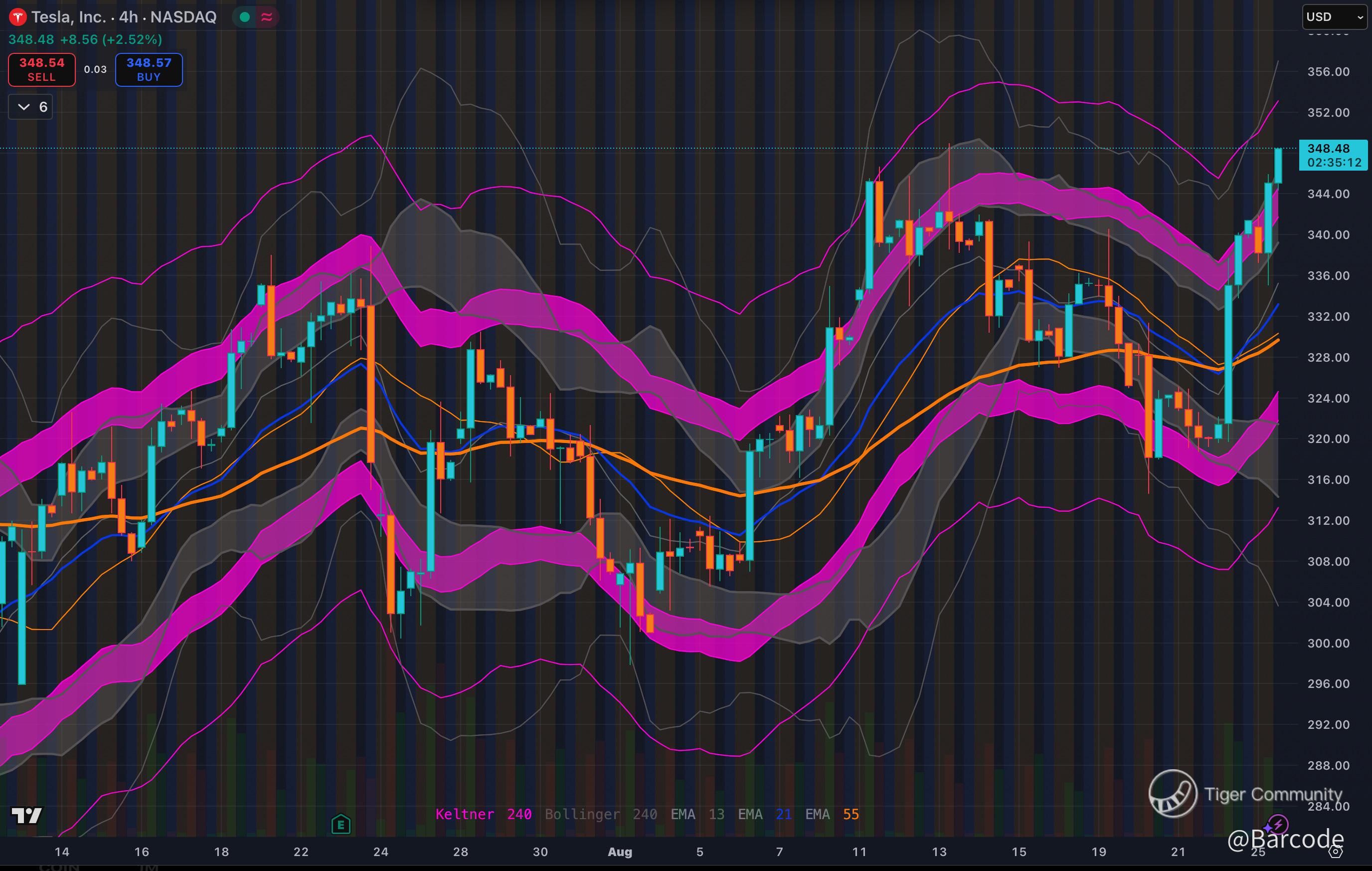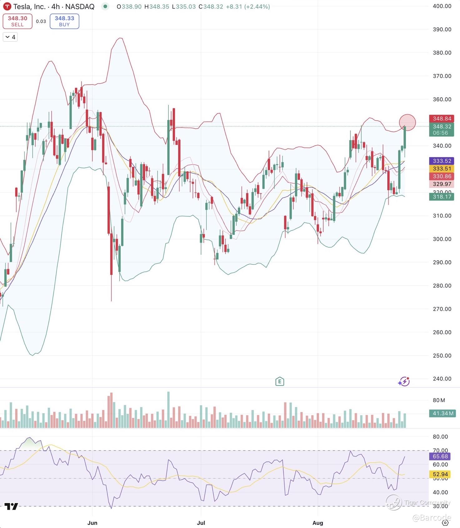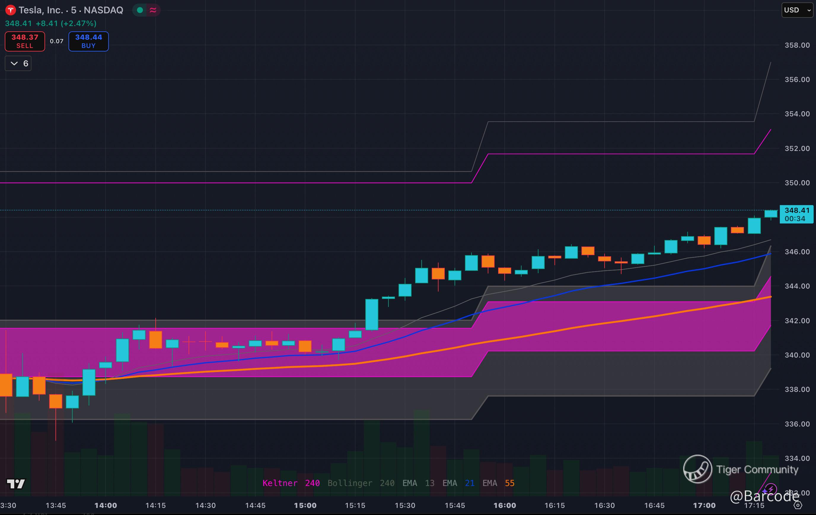 On the 4H, Bollinger and Keltner channels confirm compression resolving upward, with RSI pressing above 65. Intraday 5m charts show clean EMA alignment, reinforcing the trend. Tesla trades between a 52-week low of $202.59 and a high of $488.54; at $348, it’s mid-range but showing breakout momentum. I’m confident this structural tightening plus heavy options flow creates asymmetric upside potential.