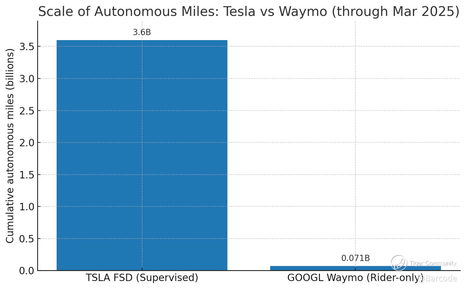 This bar chart shows Tesla’s 3.6B cumulative autonomous miles compared to Waymo’s 71M rider-only miles, highlighting the massive data advantage fueling Tesla’s AI and robotics lead 📊