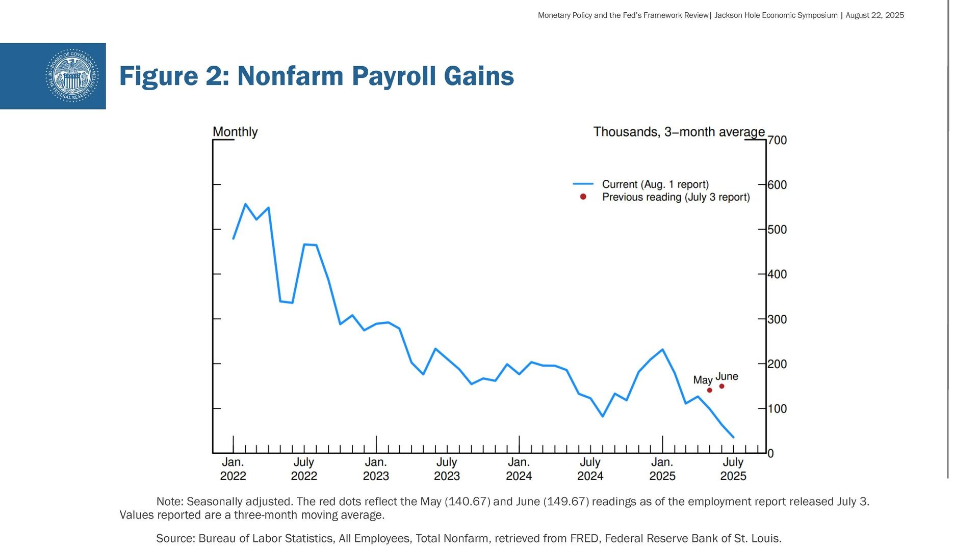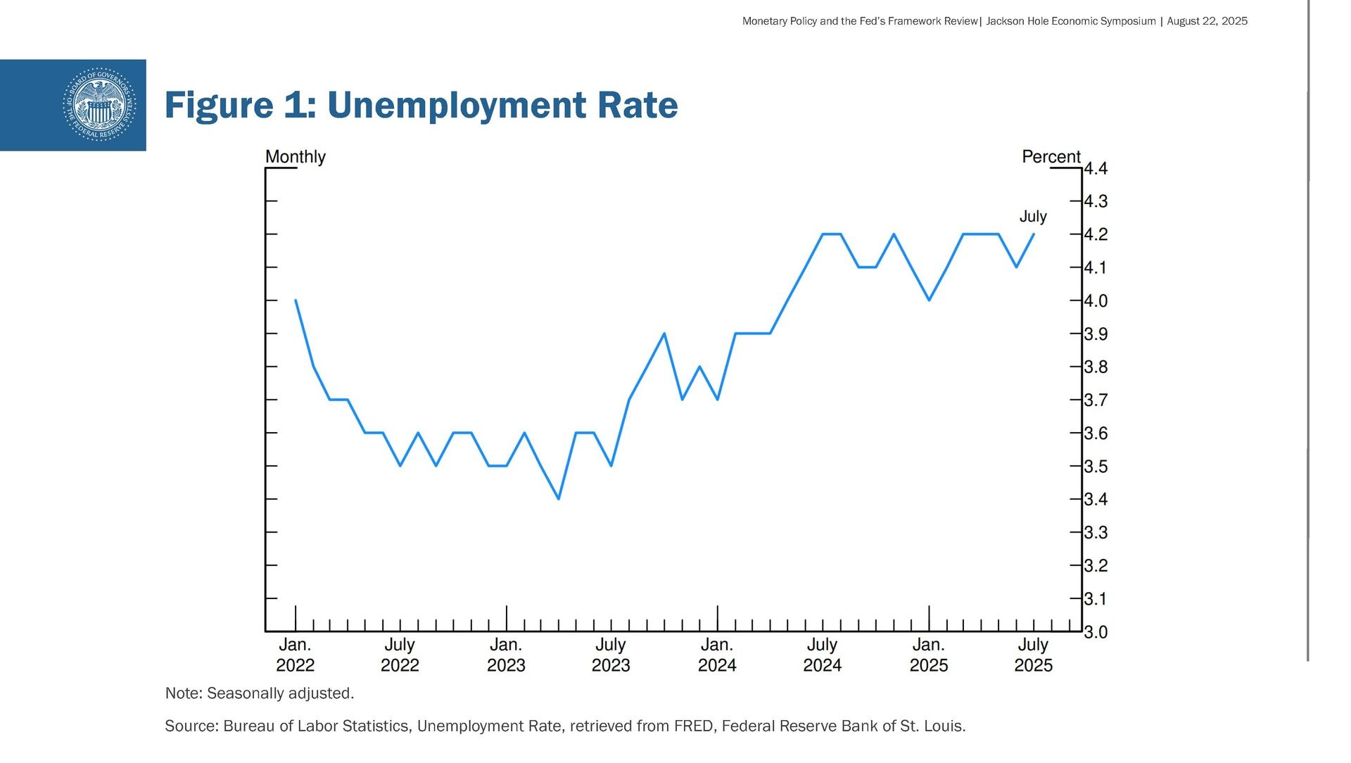 The July employment report released earlier this month showed that payroll job growth slowed to an average pace of only 35,000 per month over the past three months, down from 168,000 per month during 2024. This slowdown is much larger than assessed just a month ago, as the earlier figures for May and June were revised down substantially. But it does not appear that the slowdown in job growth has opened up a large margin of slack in the labor market—an outcome we want to avoid. The unemployment rate, while edging up in July, stands at a historically low level of 4.2 percent and has been broadly stable over the past year. Other indicators of labor market conditions are also little changed or have softened only modestly, including quits, layoffs, the ratio of vacancies to unemployment, and nominal wage growth. Labor supply has softened in line with demand, sharply lowering the "breakeven" rate of job creation needed to hold the unemployment rate constant. Indeed, labor force growth has slowed considerably this year with the sharp falloff in immigration, and the labor force participation rate has edged down in recent months.