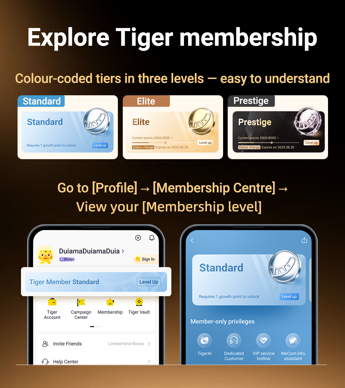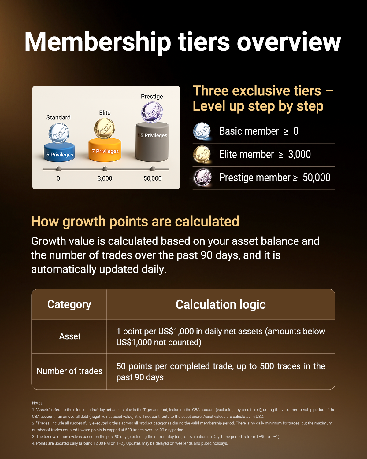If you’re wondering why your previous tier (like L7) is no longer showing — don’t worry! The previous 9-tier structure (L1–L9) has been simplified into three new levels: Standard Member, Elite Member, and Prestige Member, determined by your growth points. Simply make your first deposit to become a Tiger member! Your growth point is based on your asset value and trading activity over the past 90 days. The higher your score, the higher your tier — and the more perks you unlock. Click here to view the full rules>