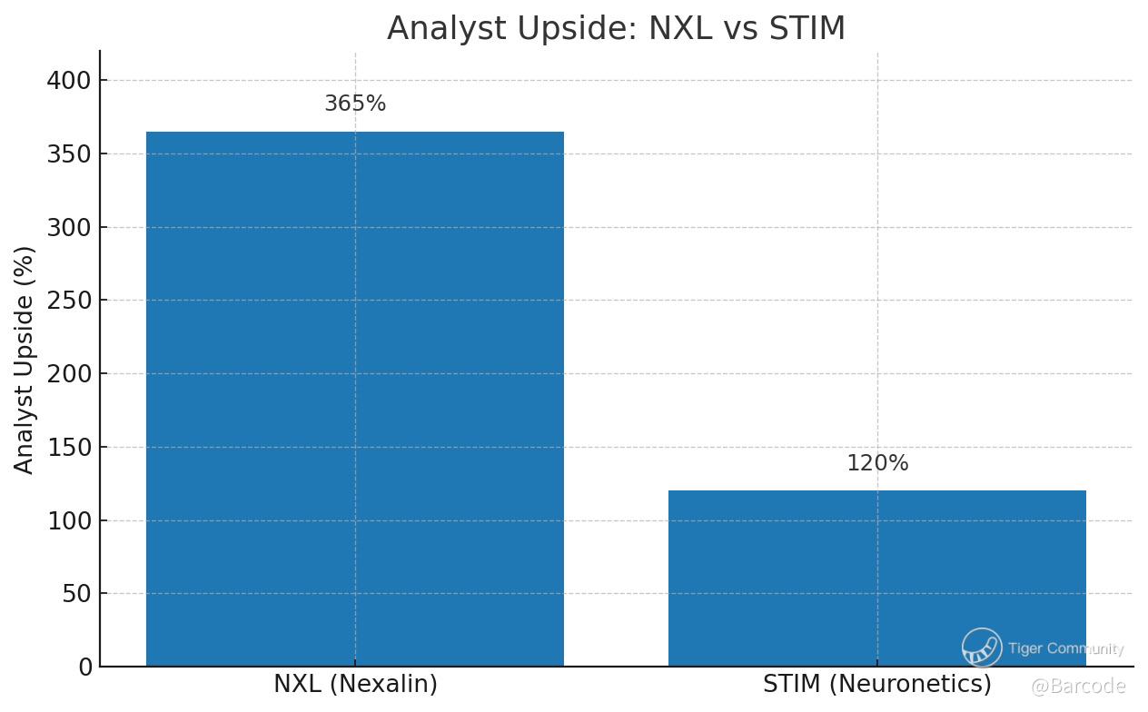 For NXL, the average 12-month target sits at $4.00 which implies roughly +365% from ~$0.86. For Neuronetics ($STIM), a neurostimulation peer, the average target is $7.00 which implies roughly +120% from ~$3.19. This comparison is unambiguous, and it pairs well with the volume-shift narrative and the September 9 webinar as the near-dated communication catalyst.
