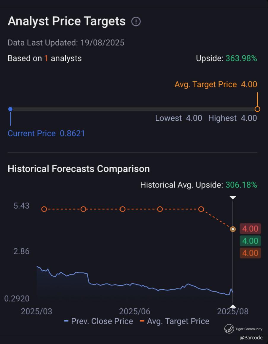One analyst has a $4 price target, implying +363.98% upside from current levels. The recommendation is a straight Buy, with no Hold or Sell positioning.