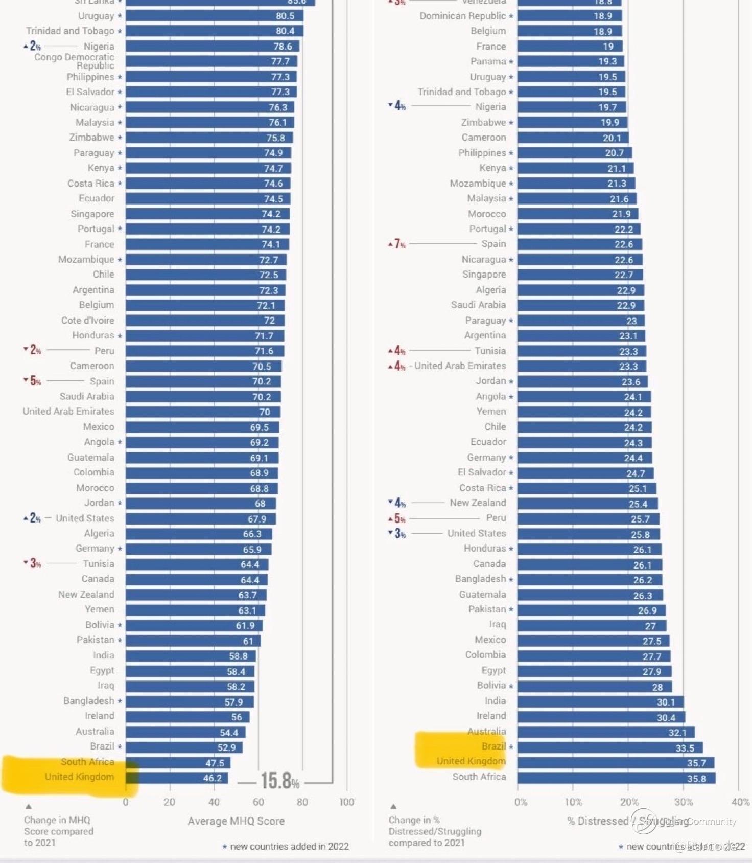 The UK population now has the lowest ranked mental wellbeing score in the world - and nearly 40% of the population are distressed/struggling.