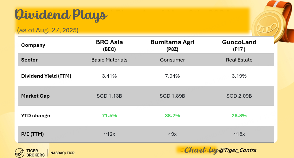 This year, F03 and AWI have shown significant upward momentum, leading the Singaporean market. This week, we continue to spotlight strong-performing dividend stocks, including 🔍 $BRC ASIA LIMITED(BEC.SI)$ / $Bumitama Agri(P8Z.SI)$ / $GuocoLand(F17.SI)$ .