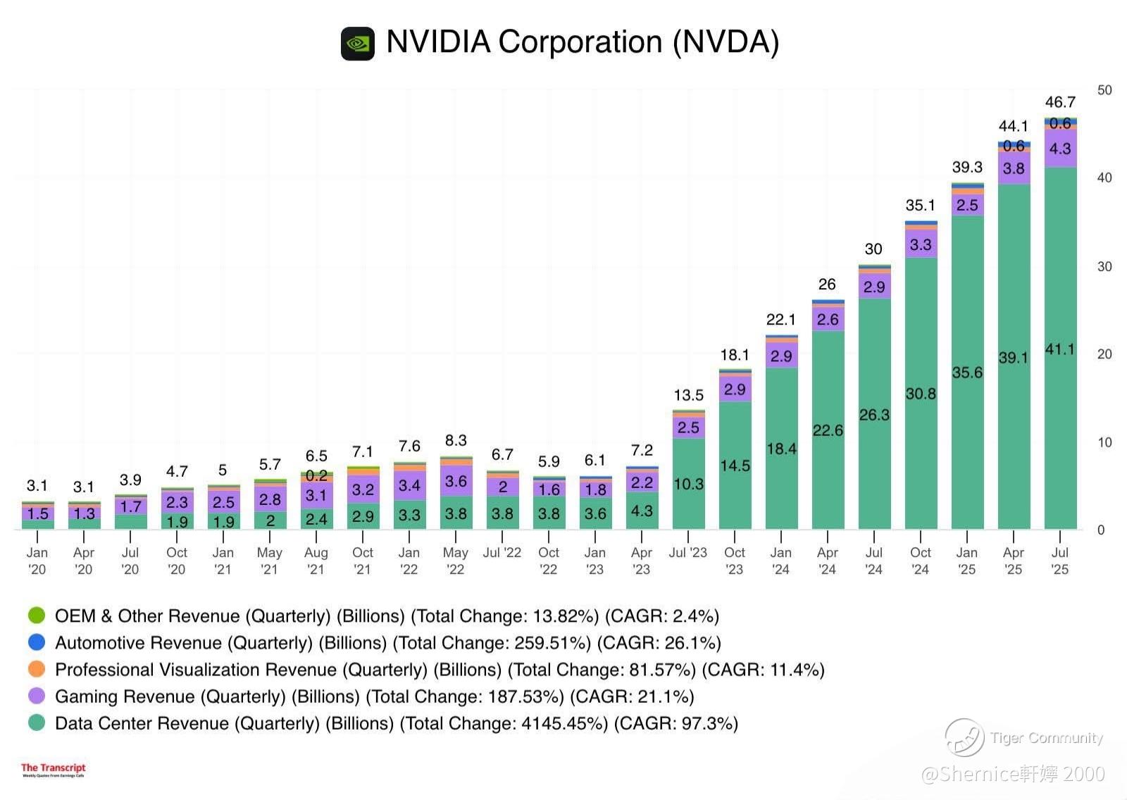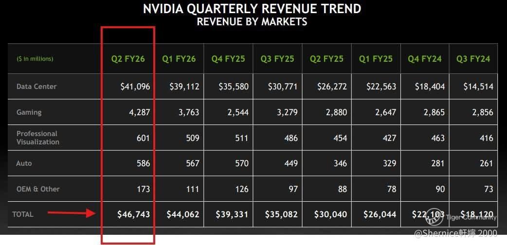 Total revenue: $46.74B, beating estimates of $46.23B (+56% YoY, but only +1.1% vs. forecast, growth momentum slowing)