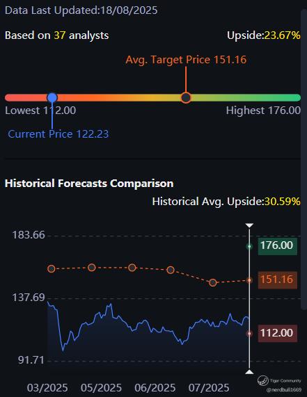Based on 37 analysts from Tiger Brokers offering 12 month price targets for Alibaba in the last 3 months. The average price target is $151.16 with a high forecast of $176.00 and a low forecast of $112.00. The average price target represents a 23.67% change from the last price of $122.23.