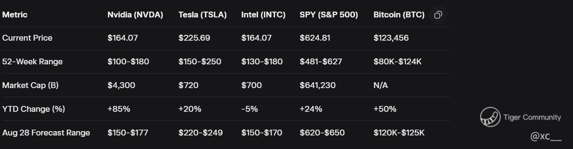 Bearish Plays: Intel at $164.07 risks $150 (9% drop) if AI woes deepen—consider $150 puts. Bitcoin at $123,456 could slide to $120,000 (3% loss); hedge with $120 puts.