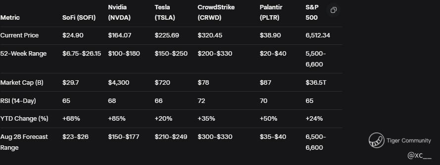 $SoFi Technologies Inc.(SOFI)$ On August 28, 2025, at 10:48 PM +08, SoFi (SOFI) has pulled back from its recent high of $26.15 to $24.90, echoing past pullbacks at similar peaks. The market, with the S&P 500 at 6,512.34, Nasdaq at 21,918.45, and Bitcoin steady at $123,456, remains in a “greed” phase, per a Fear & Greed Index hovering near 75. Tariffs (30-35% on Canada/EU/Mexico) and oil at $74.50/barrel add complexity, but which stocks are overstretched? Is it time to cash out or ride the wave? This deep dive explores overbought signals, portfolio risks, and trading moves to navigate this market.