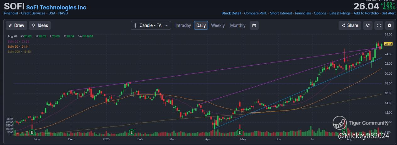 For those following SoFi, the $26 level has emerged as an important technical battleground. Historically, when the stock pushes toward this zone, it tends to encounter profit-taking pressure, stalling momentum and forcing a retracement.