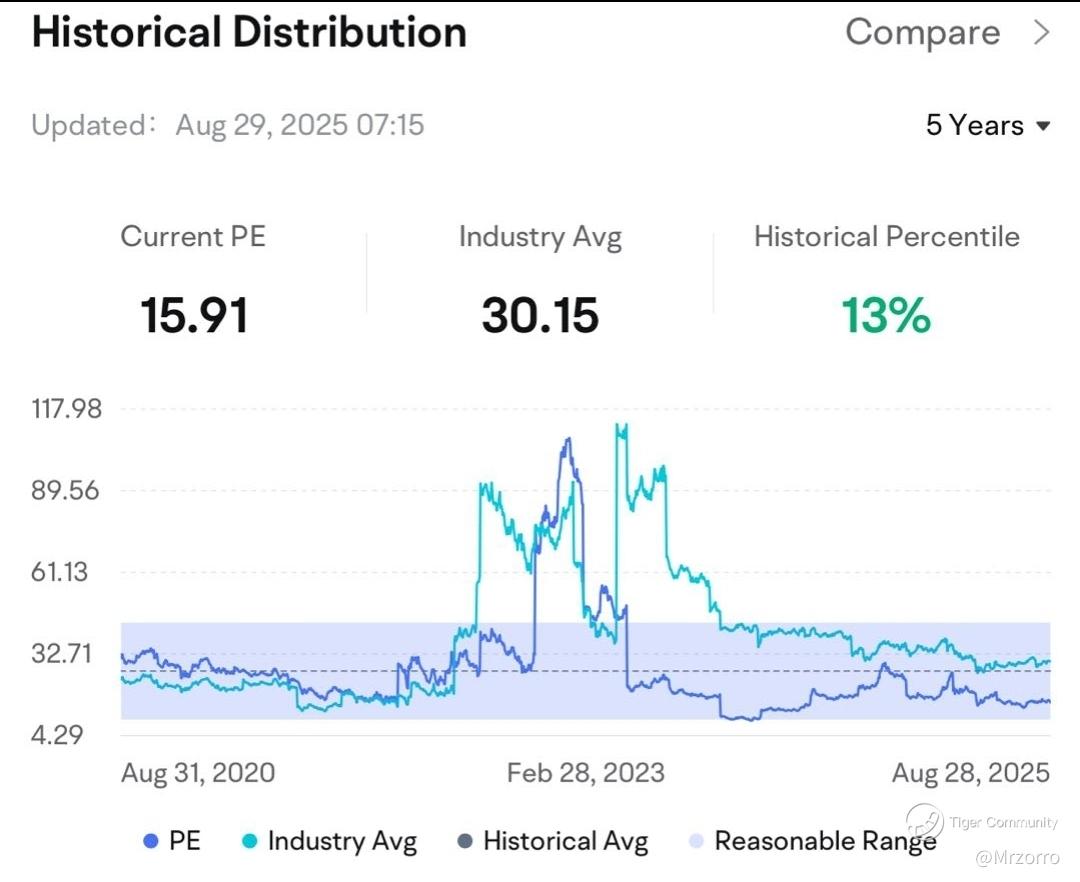 Currently, Alibaba's PE ratio is 15.91, which is below the industry average of 30.15, and is at the 13th percentile historically.