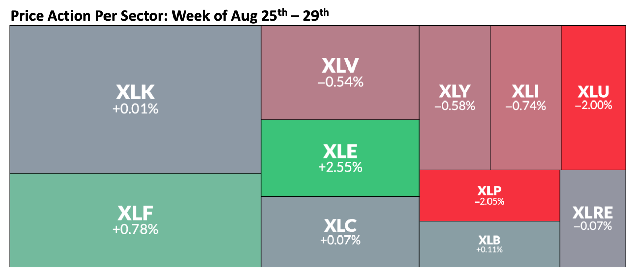 Energy and Financial sectors provided some shelter during the week. $Energy Select Sector SPDR Fund(XLE)$ led the gainers with a 2.55% rise, while $Financial Select Sector SPDR Fund(XLF)$ added 0.78%. But these gains weren't enough to offset an indecisive weekly formation that will be presented in the paid section.