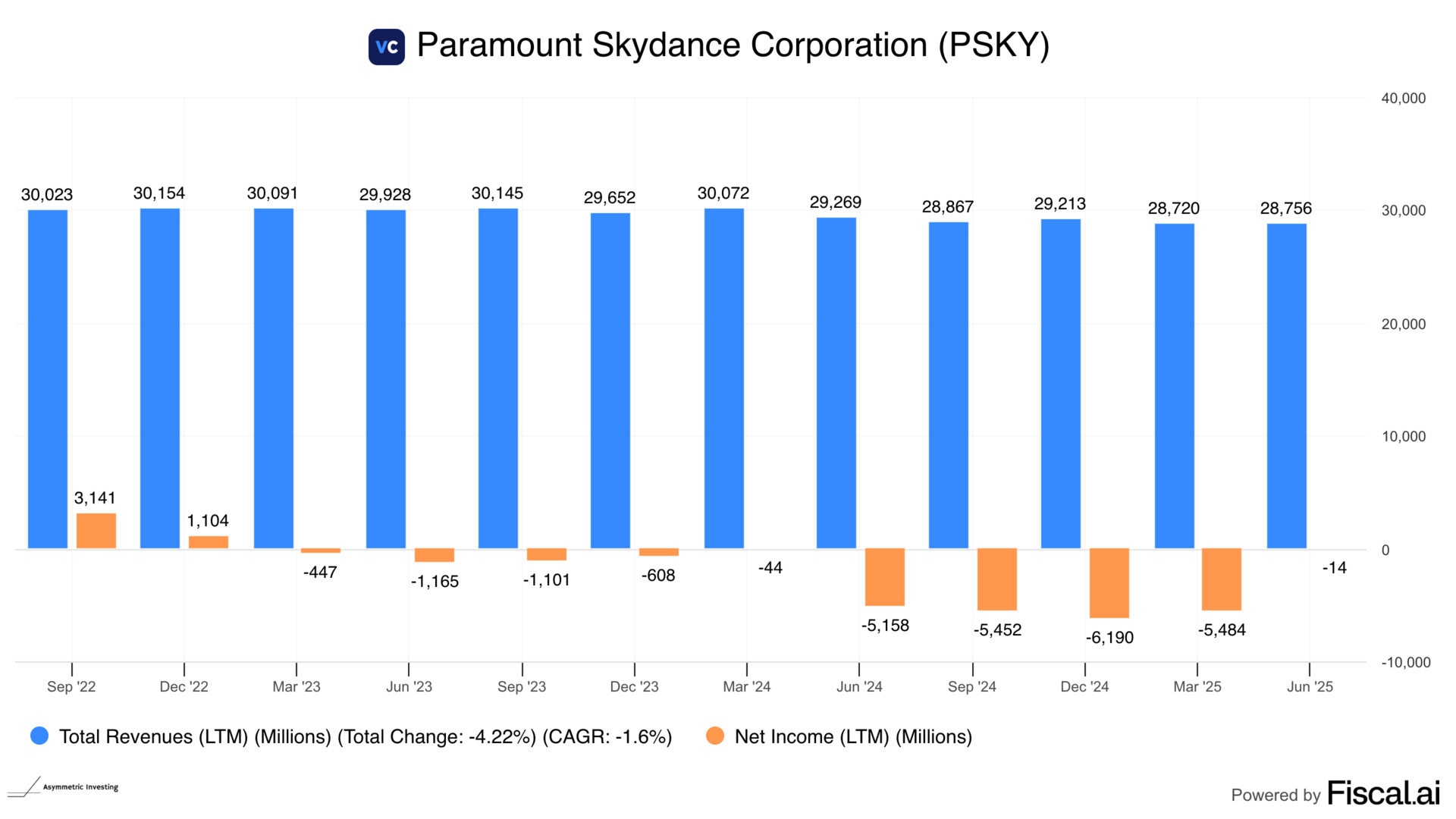 Paramount recently merged with Skydance and has a declining, unprofitable business. CBS is an asset and has an NFL deal, but Paramount+ is a small, low-cost streamer with questionable economics.