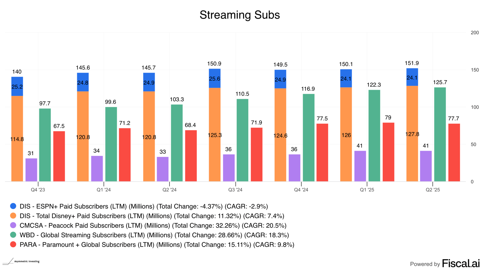 So, for the aggregation of sports fans, that puts ESPN up against Max, Paramount, Peacock, and Fox in sports streaming. And they’re all significantly smaller than Disney’s streaming footprint today $Warner Bros. Discovery(WBD)$ includes HBO cable subs, Max, Discover+, and more, all in one number, so take their total with a big grain of salt). I haven’t included Fox below because Fox’s streaming service only launched last week. They’re literally starting from ZERO in 2025!