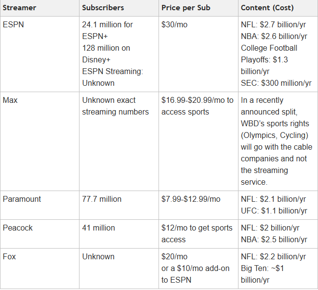 Here’s a look at the number of subscribers, price per month, and sports content for each service. We don’t know what ESPN’s streaming subscriber number will look like, but I think we will see it be bigger than ESPN+ before the end of 2026.