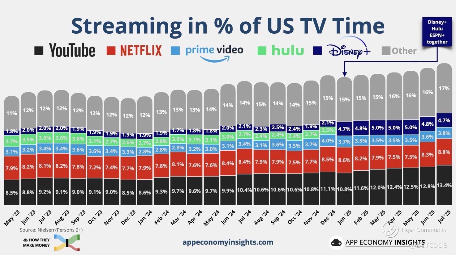 Note: Nielsen excludes YouTubeTV and Hulu Live from streaming (counted in “Other” alongside gaming). Disney apps (Disney+, Hulu, ESPN+) and Paramount apps (Paramount+, Pluto) are lumped together in their totals.