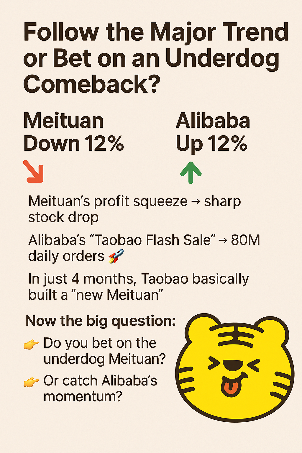 That said, Alibaba’s scale and AI push make it the safer play. Like Nvidia $NVIDIA Corp(NVDA)$ in chips, leaders may offer lower upside but greater security. My approach is to ride Alibaba’s strength while keeping an eye on Meituan in case the underdog surprises.