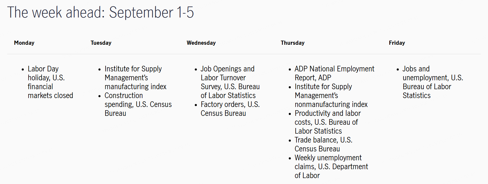 Most U.S. equity indexes ended the week modestly lower on relatively light trading volumes as markets headed into a holiday weekend and the unofficial end of summer. (U.S. markets are closed Monday, September 1, in observance of the Labor Day holiday.) Small-cap stocks performed best, with the Russell 2000 Index posting moderate gains and outperforming the S&P 500 Index for the third week in a row. Meanwhile, the Dow Jones Industrial Average logged a new record high during the week before losing ground on Friday, ultimately finishing the week lower.