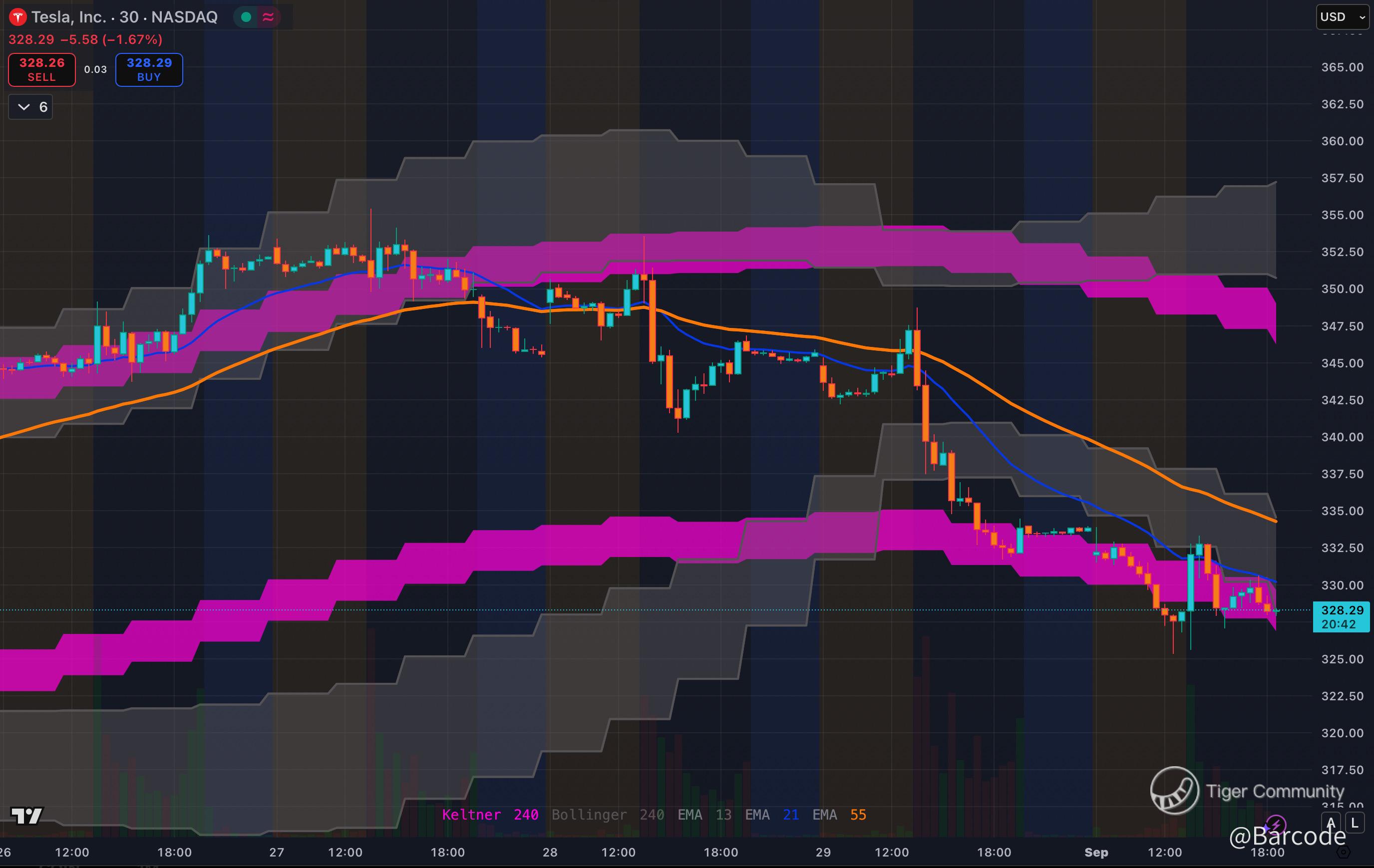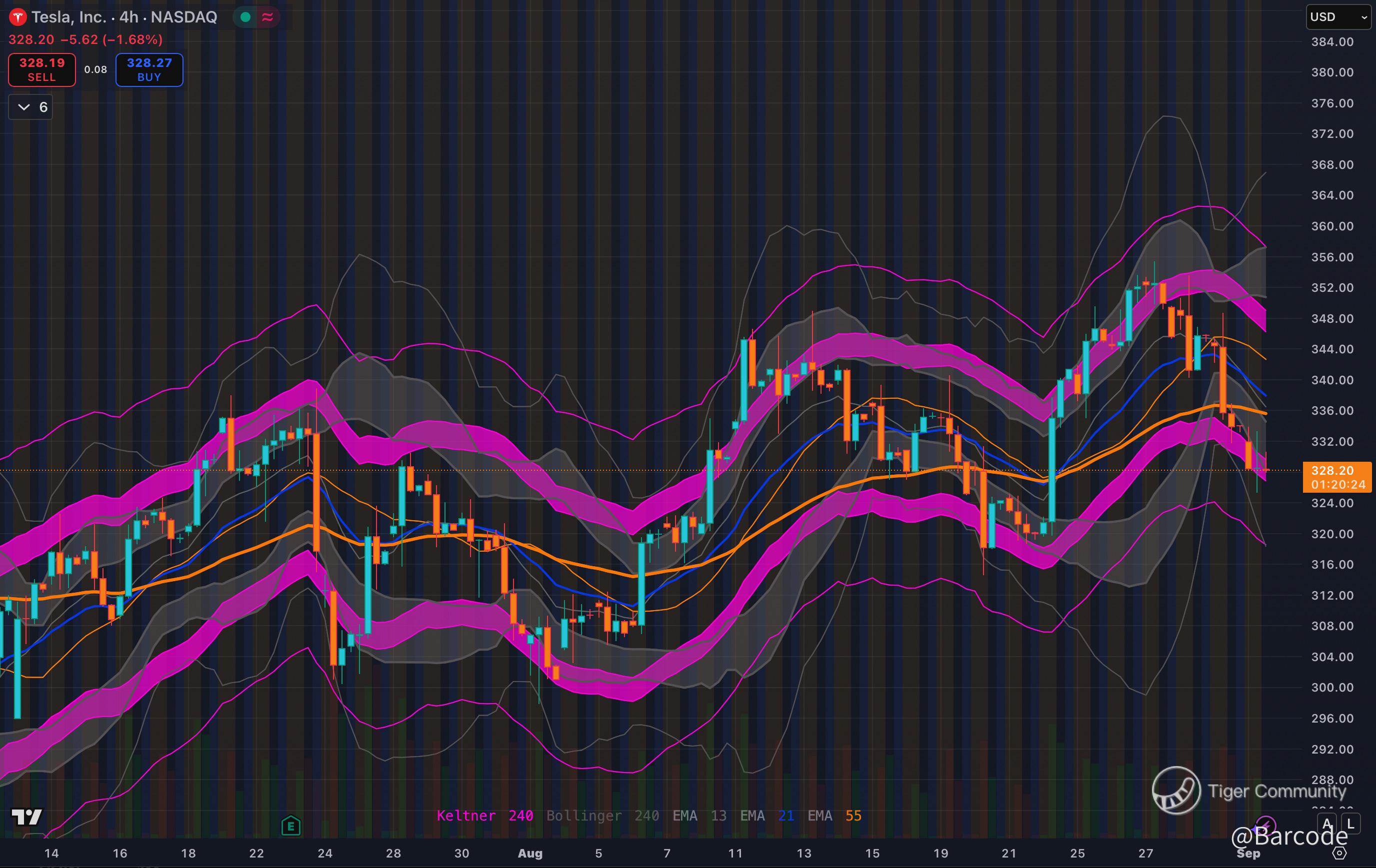 On the 4H chart, Tesla trades at $328.20, pinned near the lower Keltner and Bollinger bands, with EMAs curling lower and the 55 EMA acting as heavy resistance.