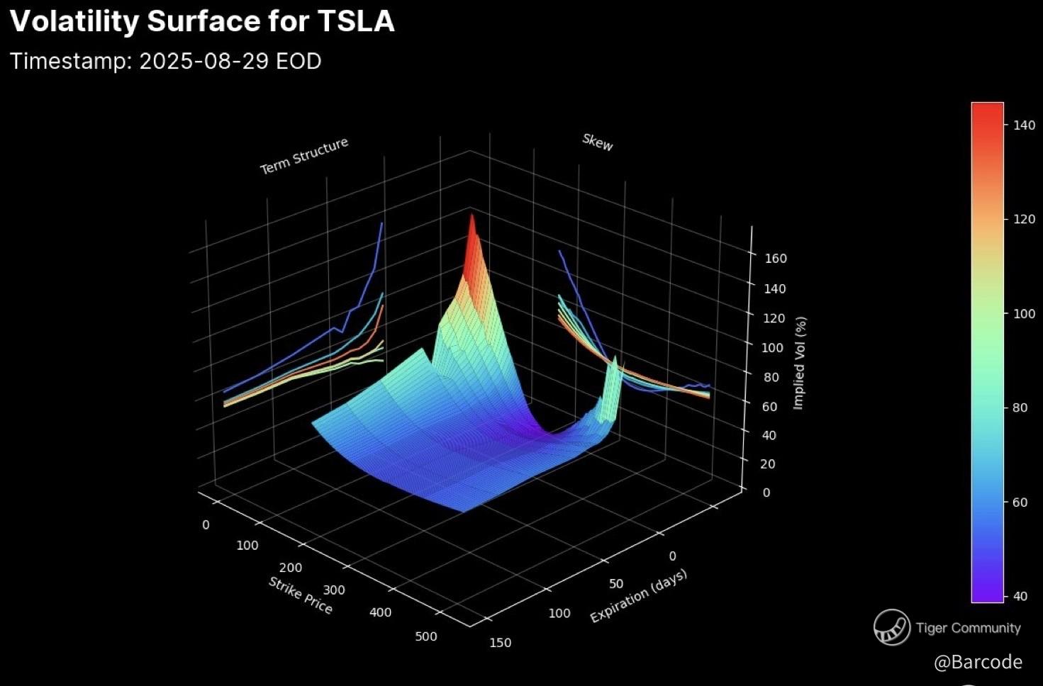 The volatility surface from 29Aug25 shows a sharp downside skew; puts around $300–320 remain in strong demand.