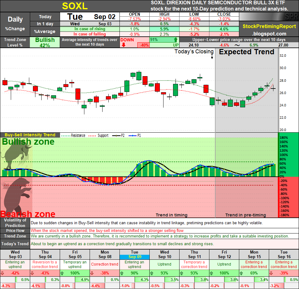 SOXL declined -3.03% to close at $25.3, extending its recent correction within a broader bullish cycle. The stock has been in the Bullish Zone for 14 days, though the cumulative performance since entry reflects a -9.8% drawdown from the buy-in at $28.