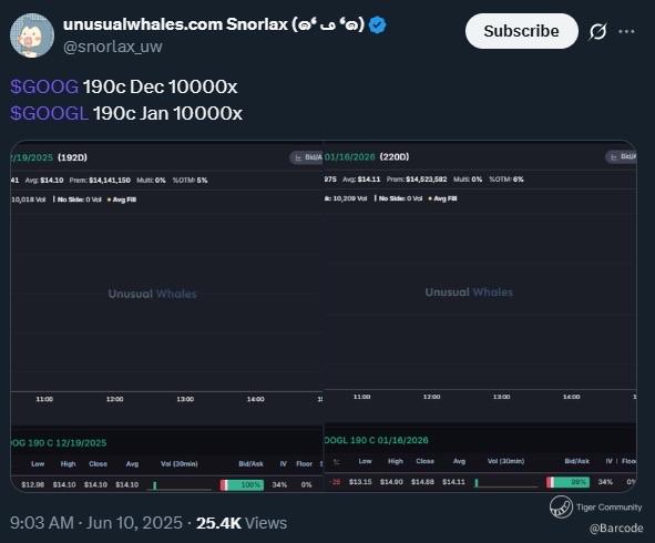 • 10,000 contracts of $GOOGL Jan 16, 2026 $190C at ~$14.14