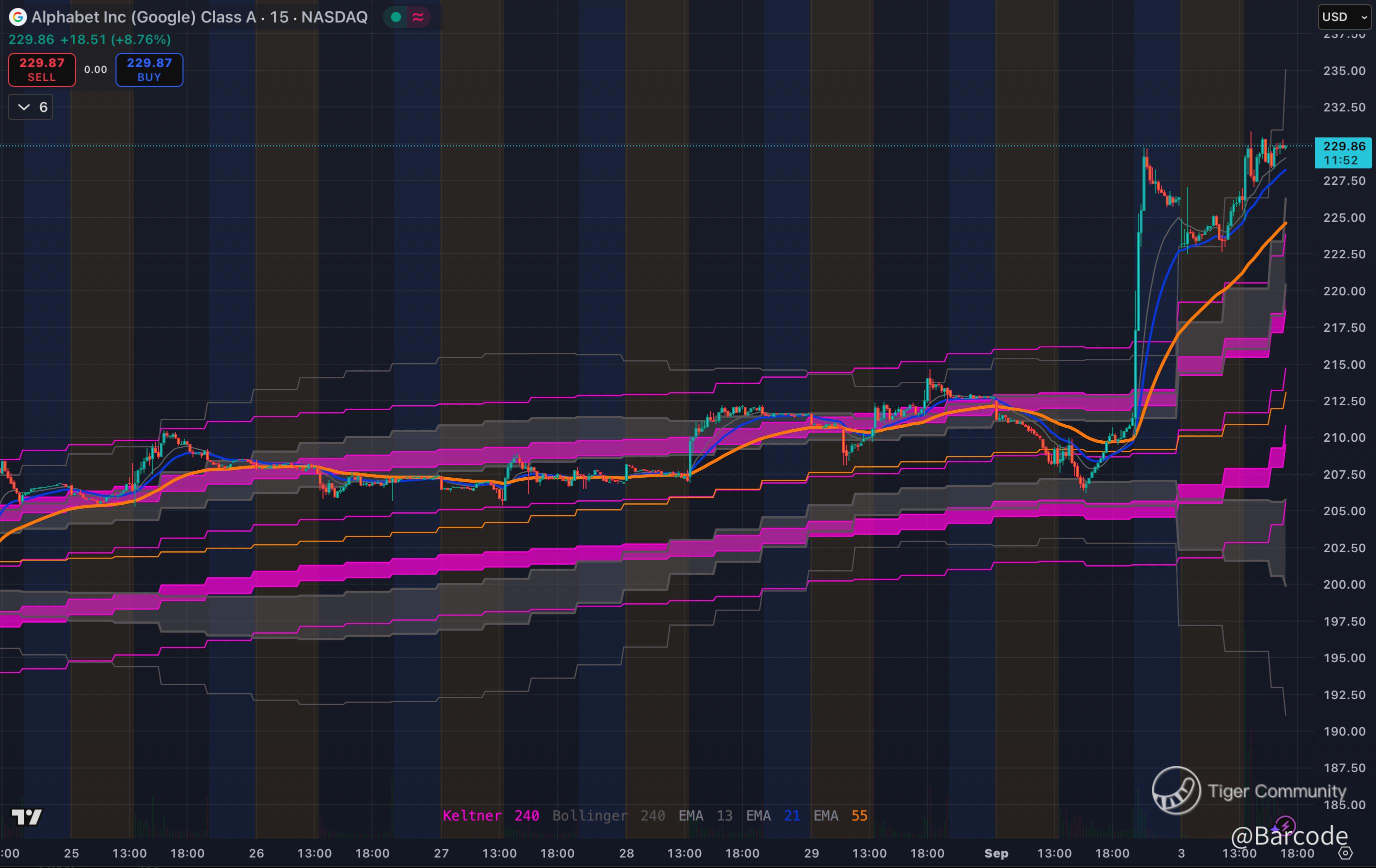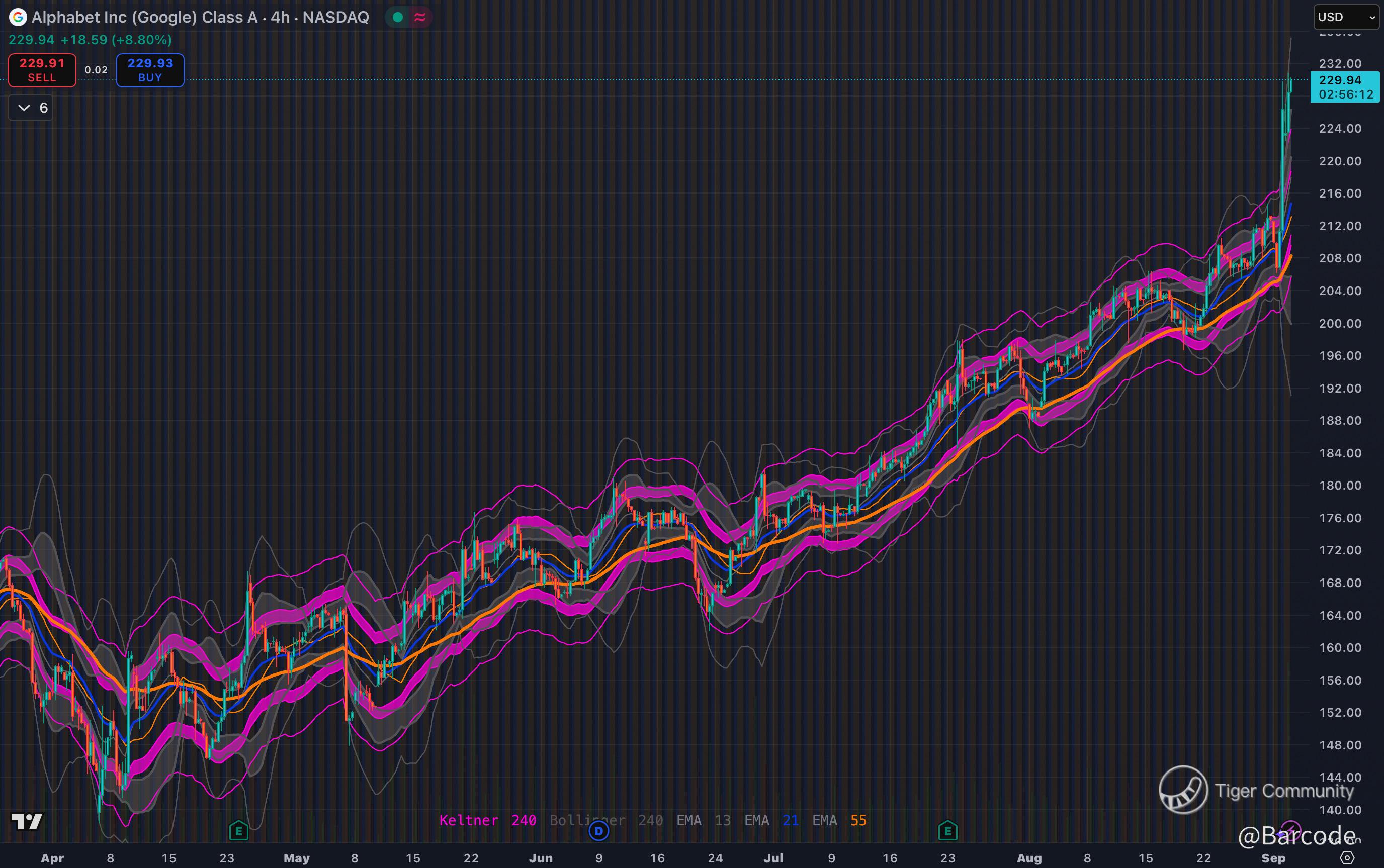 The charts scream conviction. On the 15-minute, price exploded from $211 to $229, shredding Keltner and Bollinger bands with EMA 13/21/55 aligned in perfect sync. The 4-hour has stair-stepped higher since April and now trades in open air with massive volume. Support rests at $225–226; $232–236 is the battleground before $248.50.