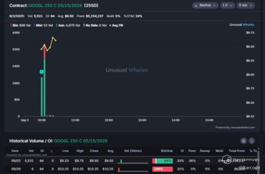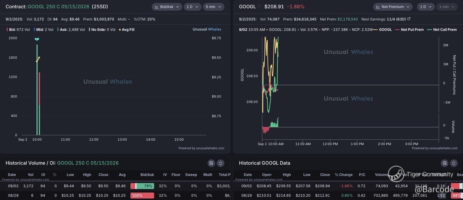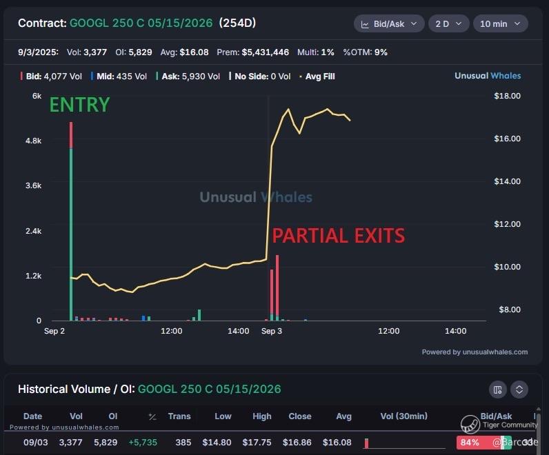 And then, just hours before the headlines dropped, another trader fired off 5,700 contracts of $GOOGL May 2026 $250C at $9.50. The very next day, partial exits went through at $15.65–$16.29. That’s a +71.5% return overnight, or ~$3.8M banked in one session, with thousands of contracts still held.