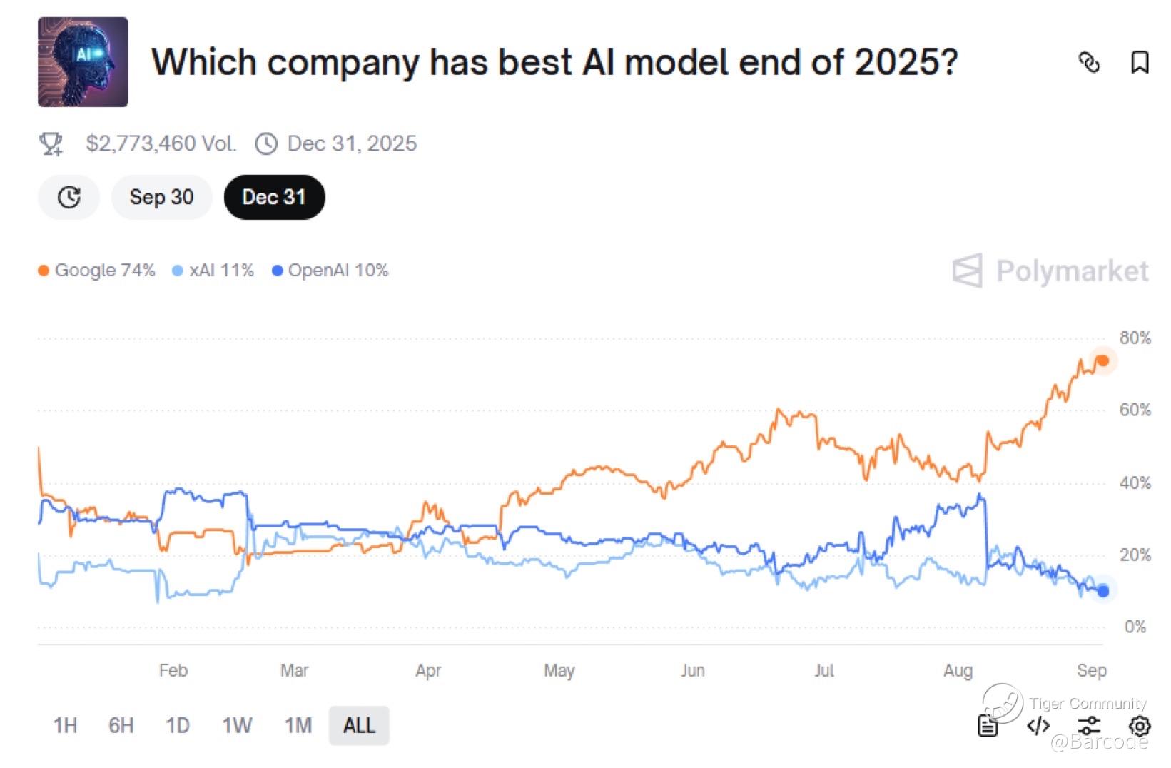 Polymarket gives Google a 74% chance of leading AI models by end-2025 (xAI: 11%, OpenAI: 10%). Alphabet’s edge: