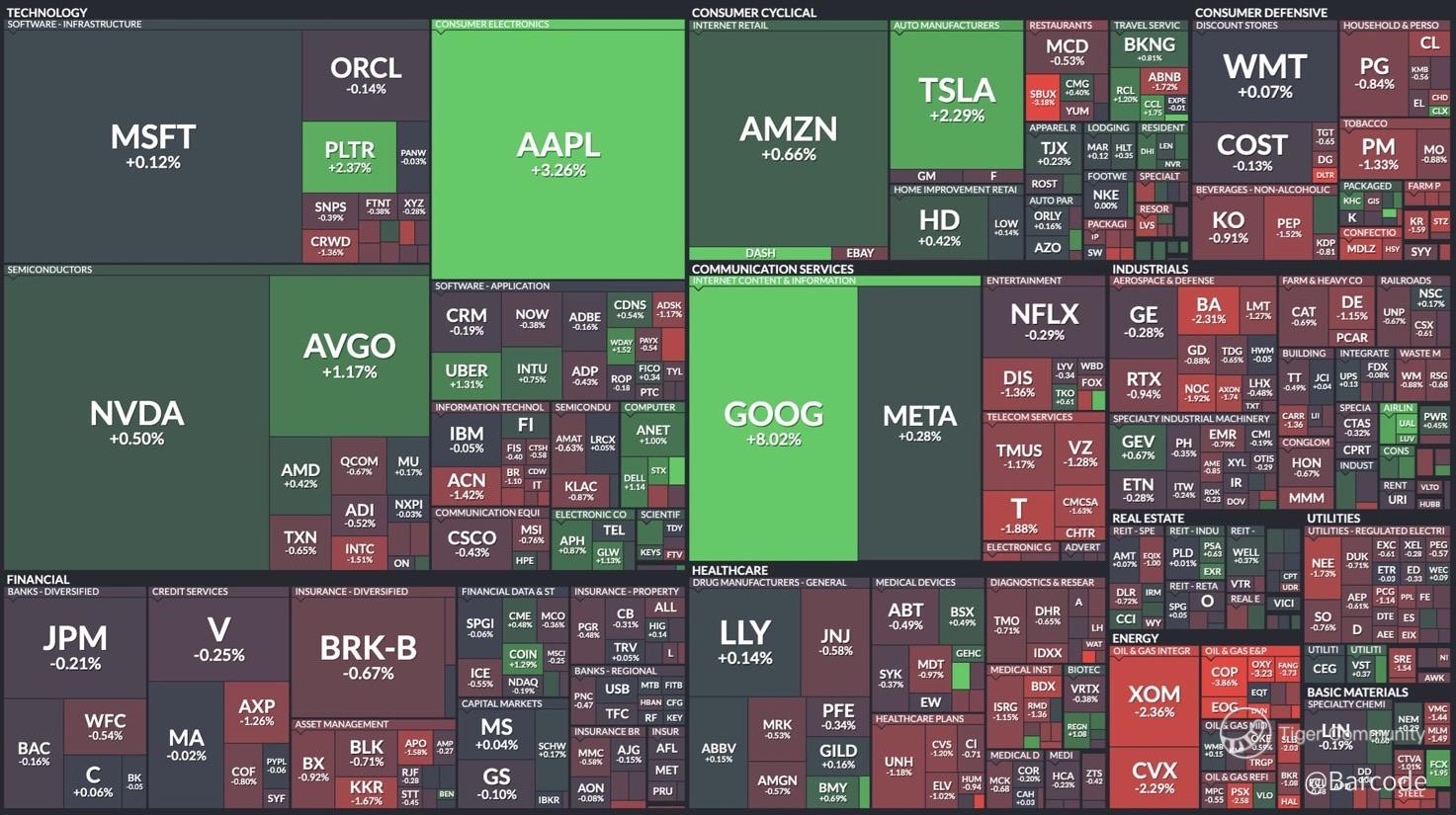 As I write, the market is still open. $GOOGL is up over 8% intraday, dragging the S&P and Nasdaq higher while the Dow lags. Tech leadership is broad: $AAPL +3%, $TSLA +2%+, $MSFT and $AMZN green, while Energy and Industrials remain heavy. This isn’t just a Google spike; it’s a mega-cap reset.