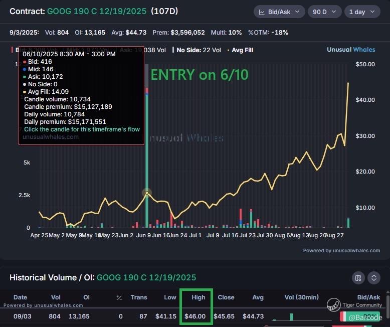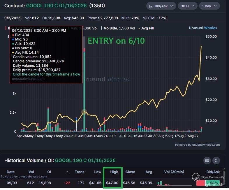 That flow you highlighted on the $190Cs is insane, it’s like catching lightning in a bottle when the news hits. I’m hyped seeing how fast it ripped from $14 to $47, feels like the market finally admitted $GOOGL’s running the AI game. That breakout zone you pointed at looks like pure liftoff energy.
