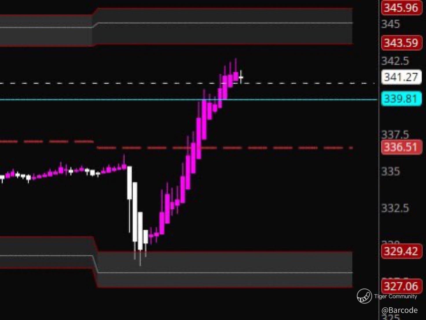 • Resistance: $343.60 (top band), $353 (Fib/Keltner stretch), $347.58 (Fib cluster), $414.50 (longer-term roadmap)
