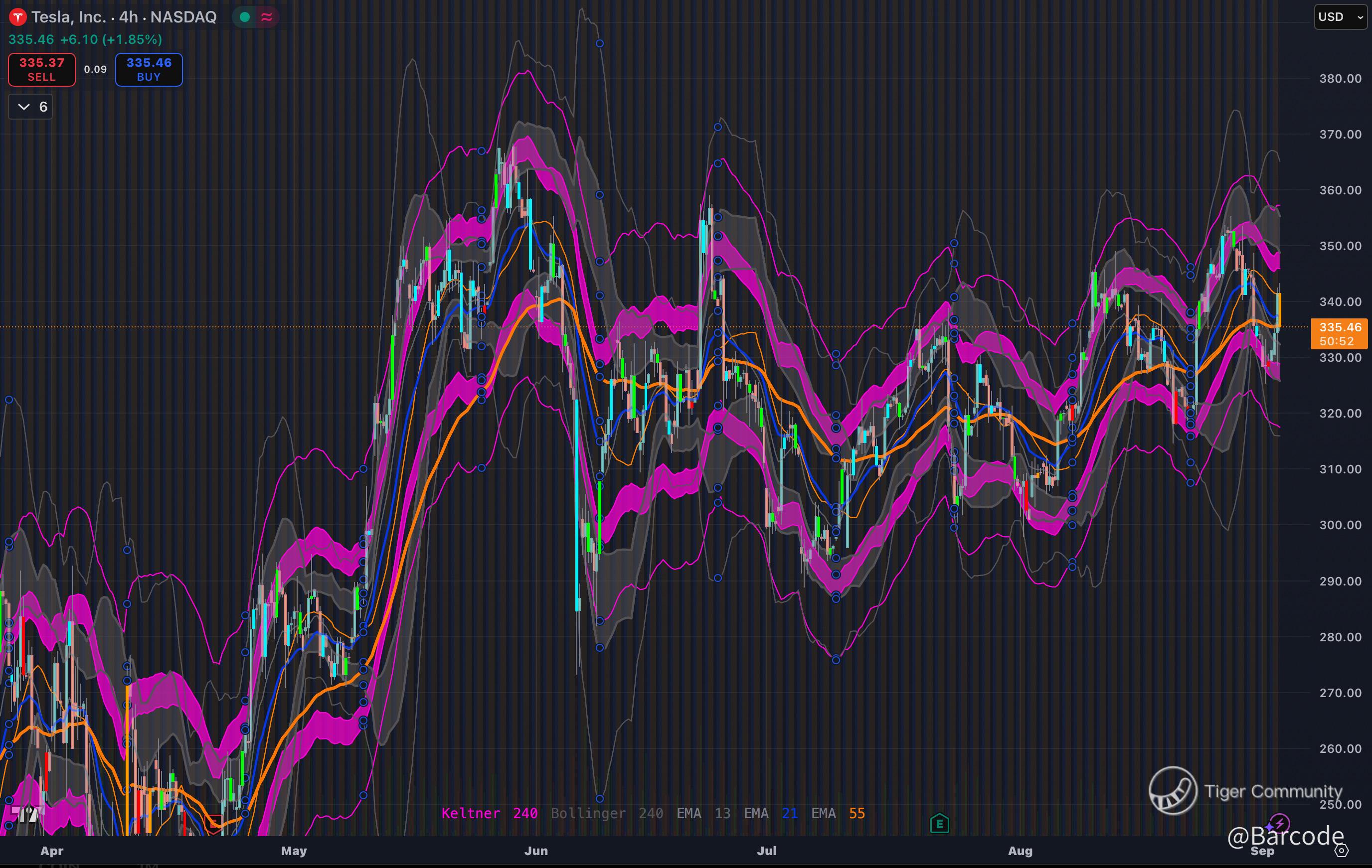I’m convinced the 4H structure remains bullish while $327 support holds. Tesla is still compressing within stacked Keltner and Bollinger channels, with an upside stretch target toward $353 if $343.60 is reclaimed. The IHS neckline breakout is valid, but the intraband retest at $336 is critical for momentum confirmation.