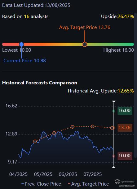 Based on 16 analysts from Tiger Brokers offering 12 month price targets for UiPath in the last 3 months. The average price target is $13.76 with a high forecast of $16.00 and a low forecast of $10.00. The average price target represents a 26.47% change from the last price of $10.90.