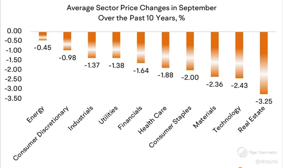 The healthcare sector, often considered a defensive stock, did not serve as a safe haven in September, instead showing a high probability of decline at 80% over the past decade.