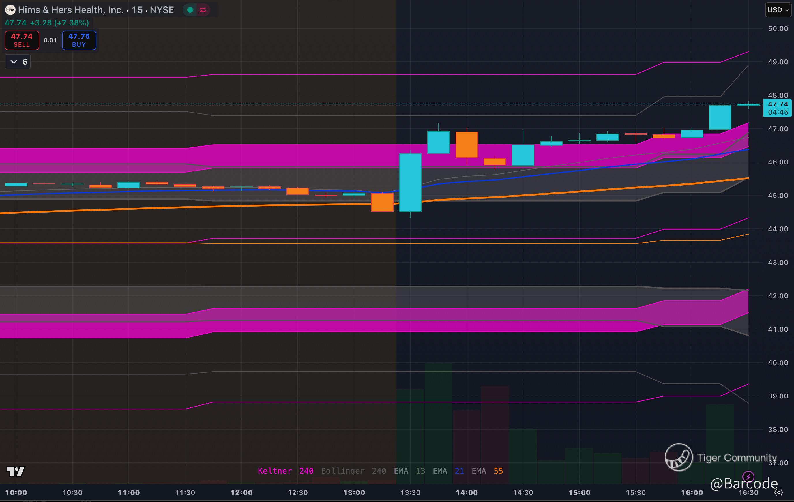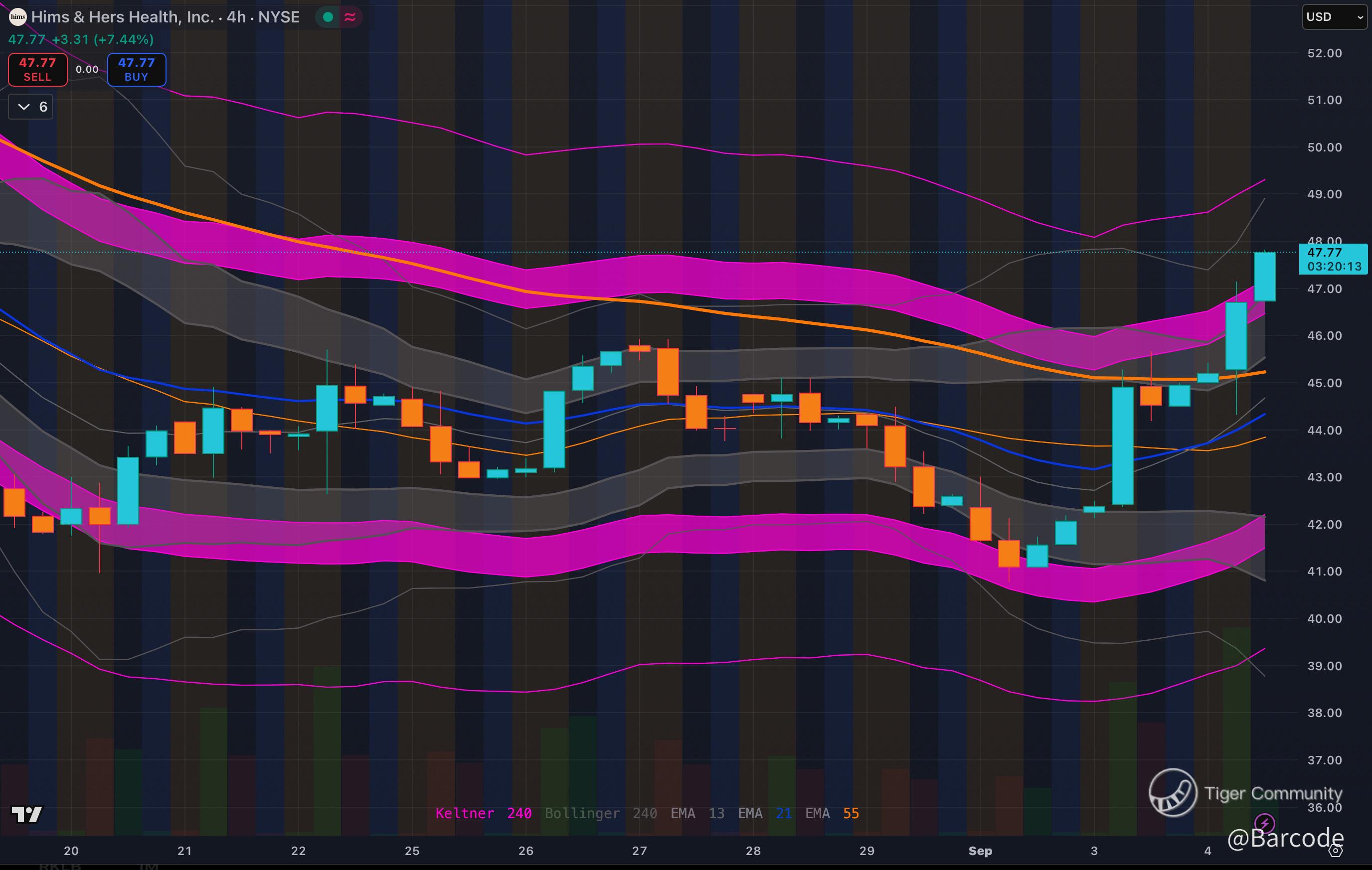 $Hims & Hers Health Inc.(HIMS)$ 🤣 $HIMS just handed BofA’s $28 underperform rating a masterclass in irrelevance, ripping +7.4% to $47.77 while the Street clings to old narratives. FDA vs court battles may decide compounding in theory, but the market’s verdict is clear in practice: breakout through Keltner/Bollinger, EMAs flipping bullish, and buyers pressing higher. Sometimes price is the best cross-examiner.