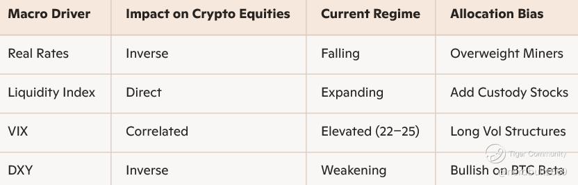 Action: Use macro overlays (e.g., DXY, VIX, Fed balance sheet) to dynamically adjust exposure. For example, overweight crypto miners when real rates fall and liquidity expands.