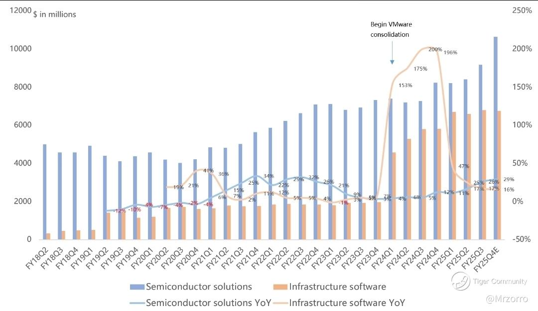 1. Semiconductor Solutions: Revenue reached $9.2 billion, marking a 26% YoY and 9% QoQ increase. This segment, which includes networking, wireless, broadband, storage, industrial, and XPU chips, accounted for 57% of total revenue. The segment's gross margin was 67% (down 0.3 p.p. YoY) with an operating margin of 57%.